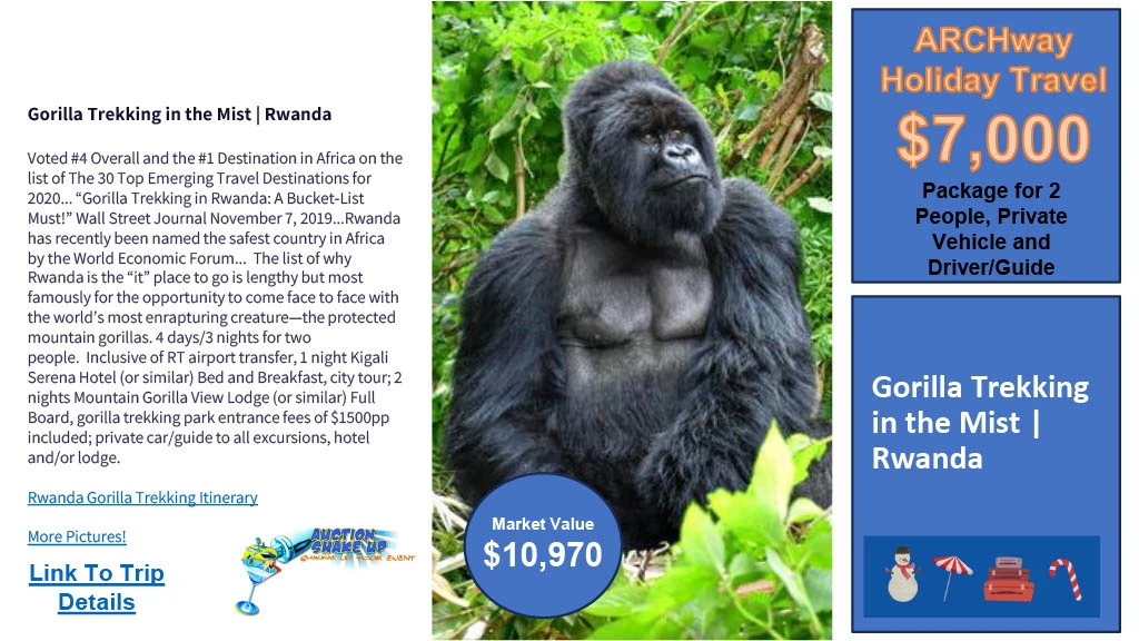 Voted #4 Overall and the #1 Destination in Africa on the list of The 30 Top Emerging Travel Destinations for 2020… “Gorilla Trekking in Rwanda: A Bucket -List Must!” Wall Street Journal November 7, 2019…Rwanda has recently been named the safest country in Africa by the World Economic Forum… The list of why Rwanda is the “it” place to go is lengthy but most famously for the opportunity to come face to face with the world’s most enrapturing creature —the protected mountain gorillas. 4 days/3 nights for two people. Inclusive of RT airport transfer, 1 night Kigali Serena Hotel (or similar) Bed and Breakfast, city tour; 2 nights Mountain Gorilla View Lodge (or similar) Full Board, gorilla trekking park entrance fees of $1500pp included; private car/guide to all excursions, hotel and/or lodge.